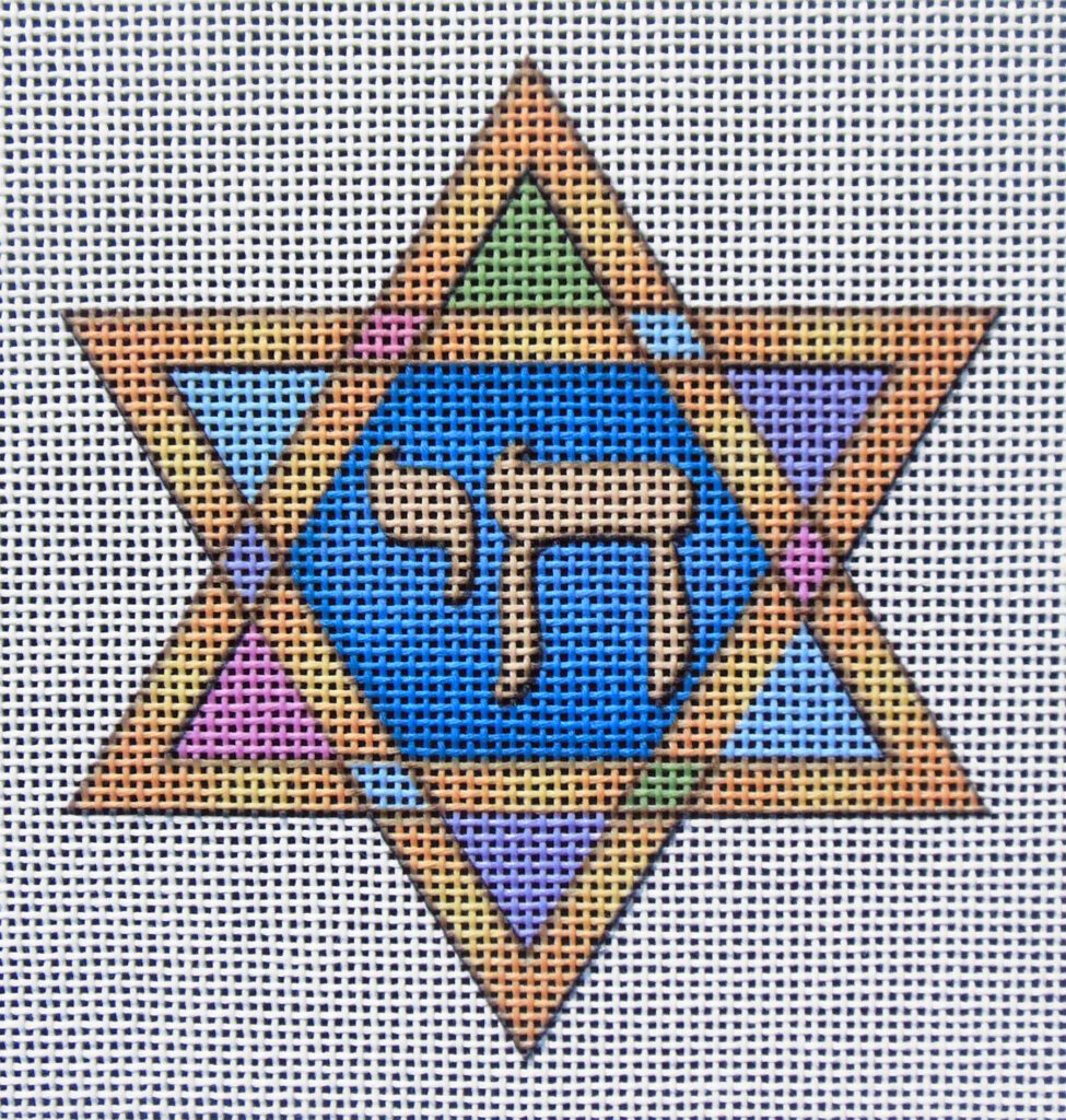 Chai: Hebrew symbol for “Life” Star measures 4″x4″ with approx. 2″ canvas border. 18 count Zweigart Deluxe mono canvas. *A portion of all Judaica Hearts & Stars sales will be donated to the Israeli Red Cross.