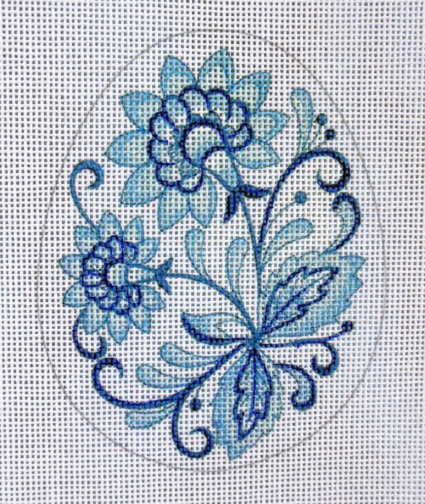 Egg measures 3.5″ wide x 4.5″ tall Original Art Print, Hand Painted Detail 18 count Zweigart Deluxe mono canvas. Stitched sample shown courtesy of Susan! canvas only