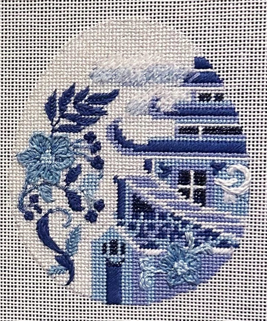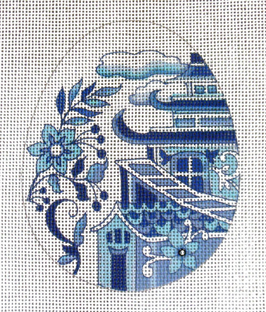 Egg measures 3.5″ wide x 4.5″ tall Original Art Print, Hand Painted Detail 18 count Zweigart Deluxe mono canvas. Stitched sample shown courtesy of Susan! canvas only