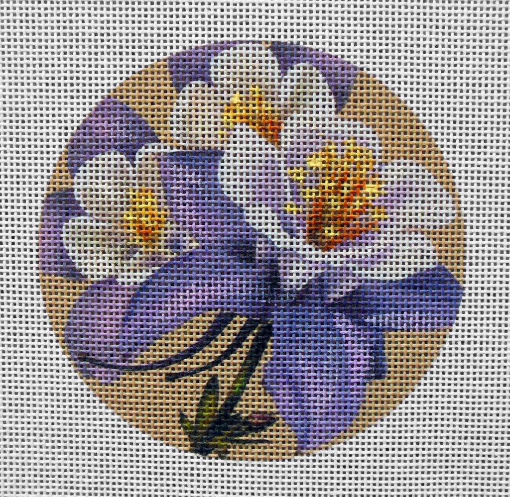 Columbine Ornament measures 4″ round with 2″ blank canvas surround.