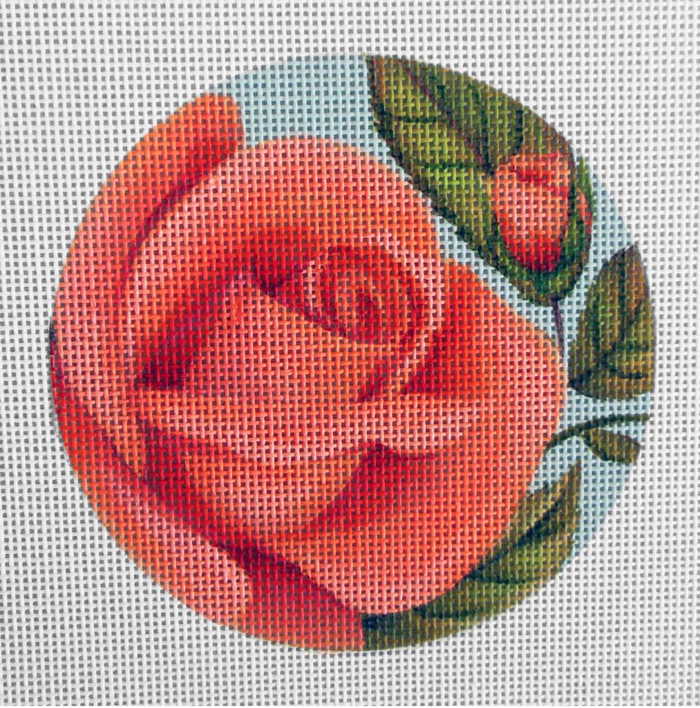 Coral Rose Ornament measures 4″ round with 2″ blank canvas surround.