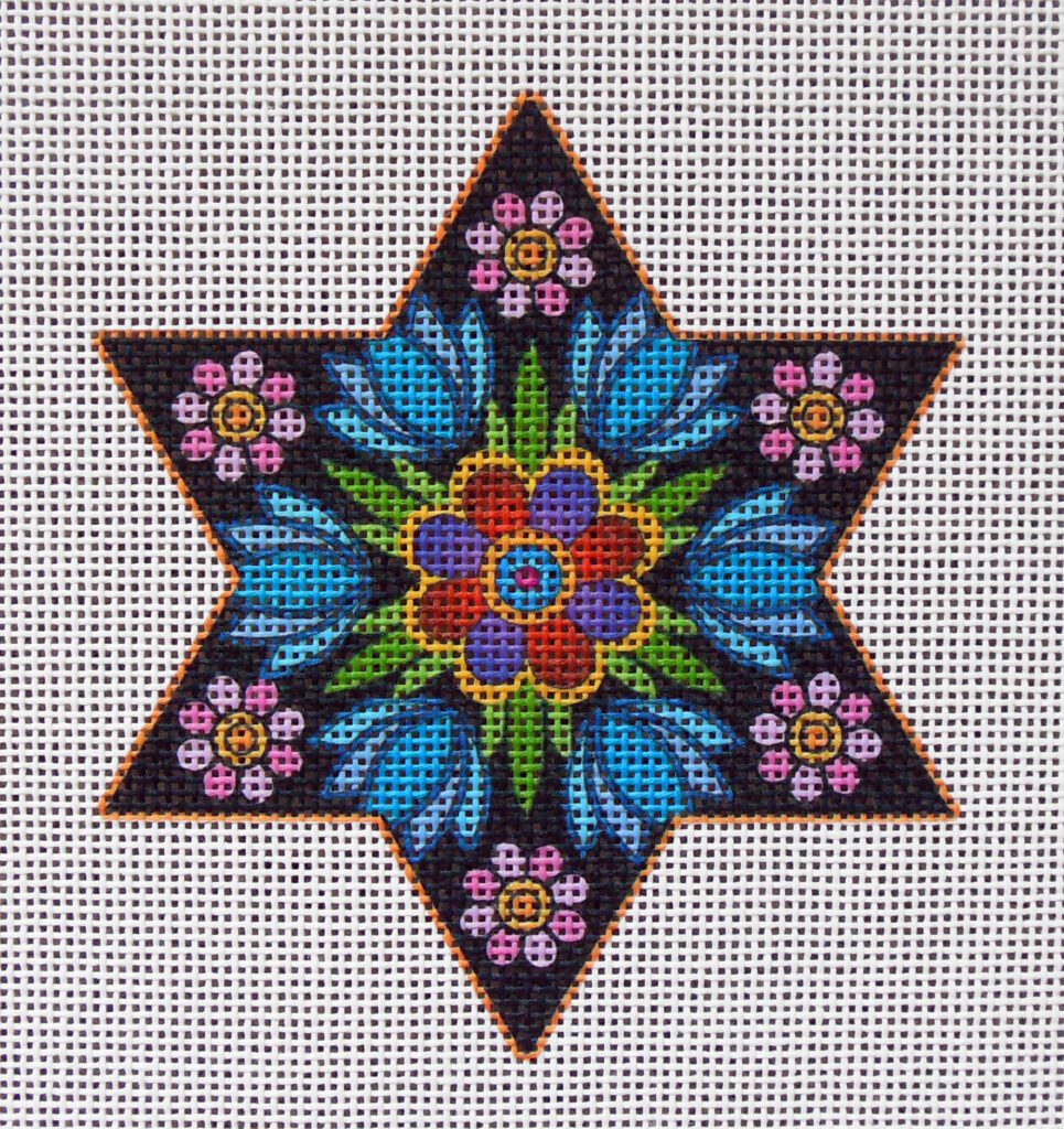 Star measures 4″x4″ with approx. 2″ canvas border. 18 count Zweigart Deluxe mono canvas. *A portion of all Judaica Hearts & Stars sales will be donated to the Israeli Red Cross.