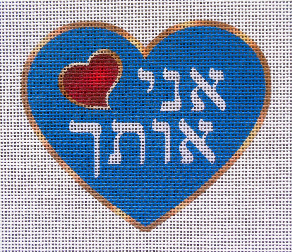 “I Love You” in Hebrew letters, heart measures 4″ wide x 3.5″ tall with approx. 2″ canvas border. 18 count Zweigart Deluxe mono canvas. *A portion of all Judaica Hearts & Stars sales will be donated to the Israeli Red Cross.