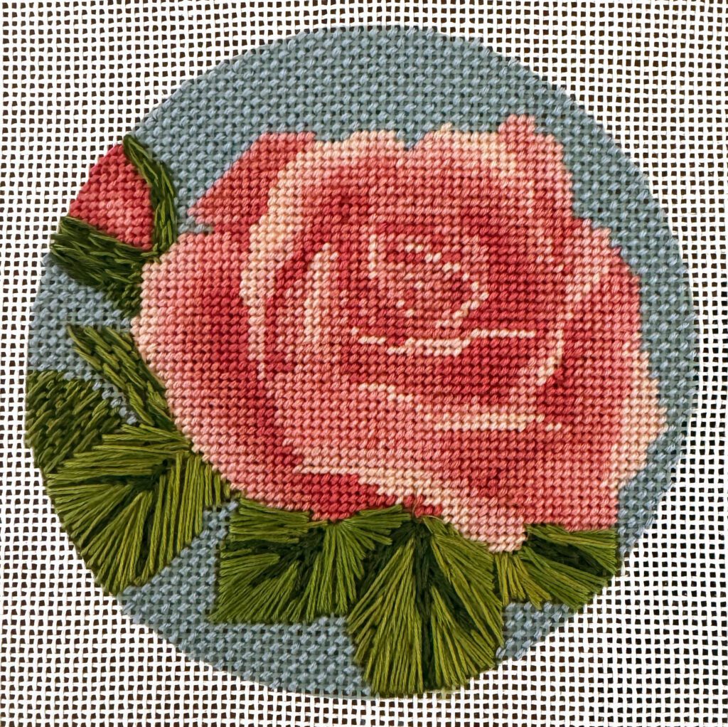 Pink Rose Ornament measures 4″ round with 2″ blank canvas surround.