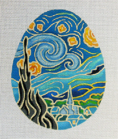 An all time favorite, my reproduction for needlepoint, “Starry Night” measures 4″x 5″ with 2″ canvas margin.